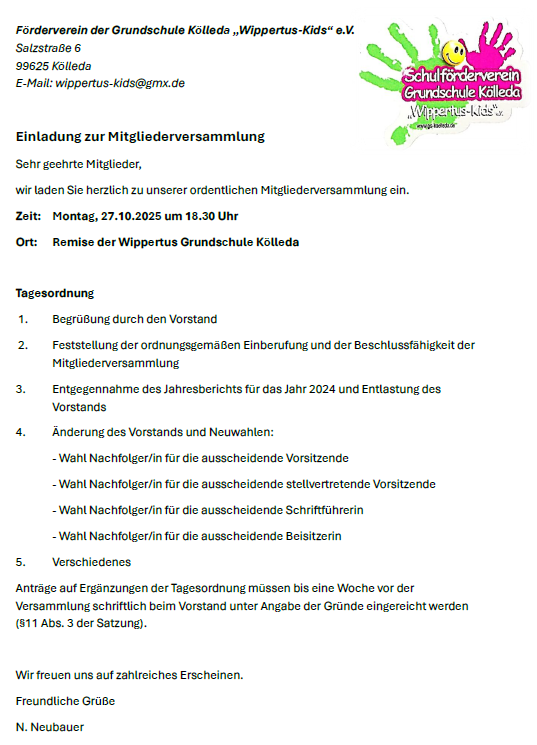 Einladung zur Mitgliederversammlung des Schulfördervereins Wippertus Kids e.V.